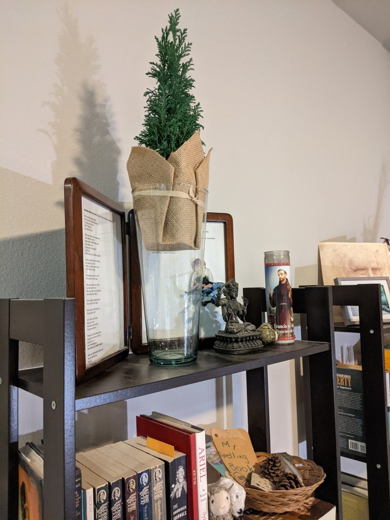 There I found a teeny tree wrapped in burlap (over on the left there), just perfect for now. (One side of tag named it “European Cypress” (or “Chamaecyparis lawsoniana “Elwoodi”…Python speak, but I’m quoting direct off the tag, seriously) while the other side of tag described it as “native to the western United States”.) Go figure. Maybe “pining for the fjords.” Python speak.